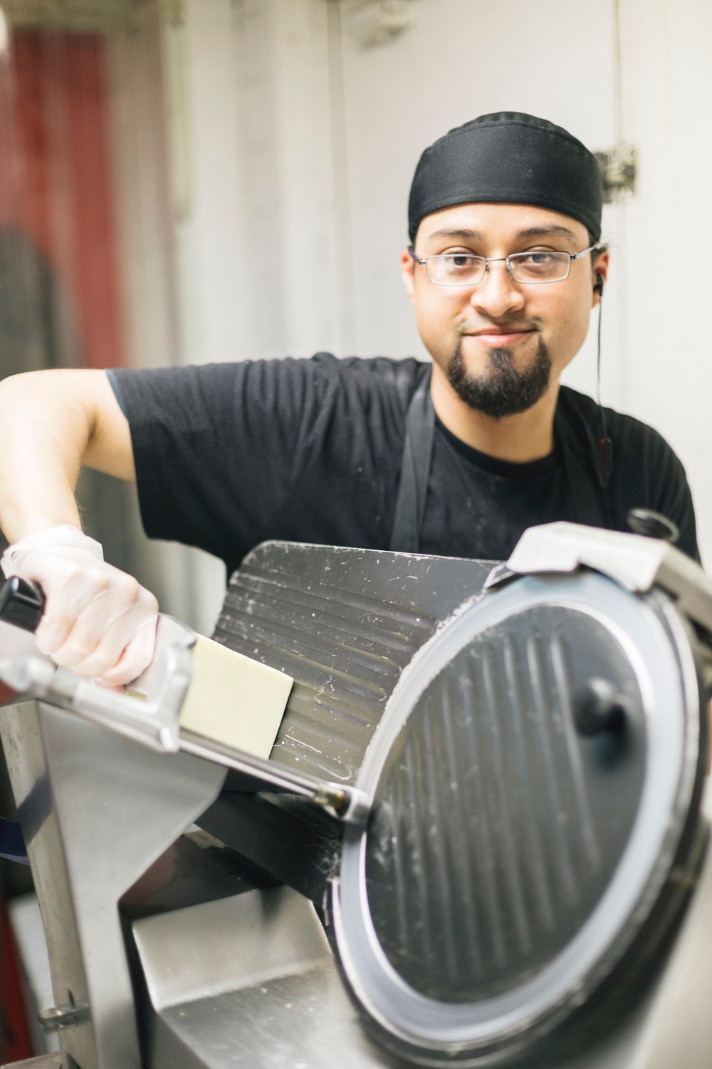 Shredded beef with a squeeze of lime, mayonnaise, homemade ketchup, lettuce, sliced tomato, grilled onions, crispy potato stix, melted jack, served on a challah bun and pressed down on a flat top grill.